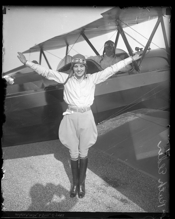 aviatrix Ruth Elder with arms out stretched in front of her plane, California, circa 1927