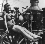 High diver Beatrice Kyle sitting on a fire engine wheel between acts at the Society Circus at Fort Myer, VA, for the benefit of the Army Relief Fund – April 25, 1924