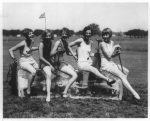 Dorothy Kelly, Virginia Hunter, Elaine Griggs, Hazel Brown and Mary Kaminsky in bathing suits seated on two large blocks of ice, Washington, D.C.