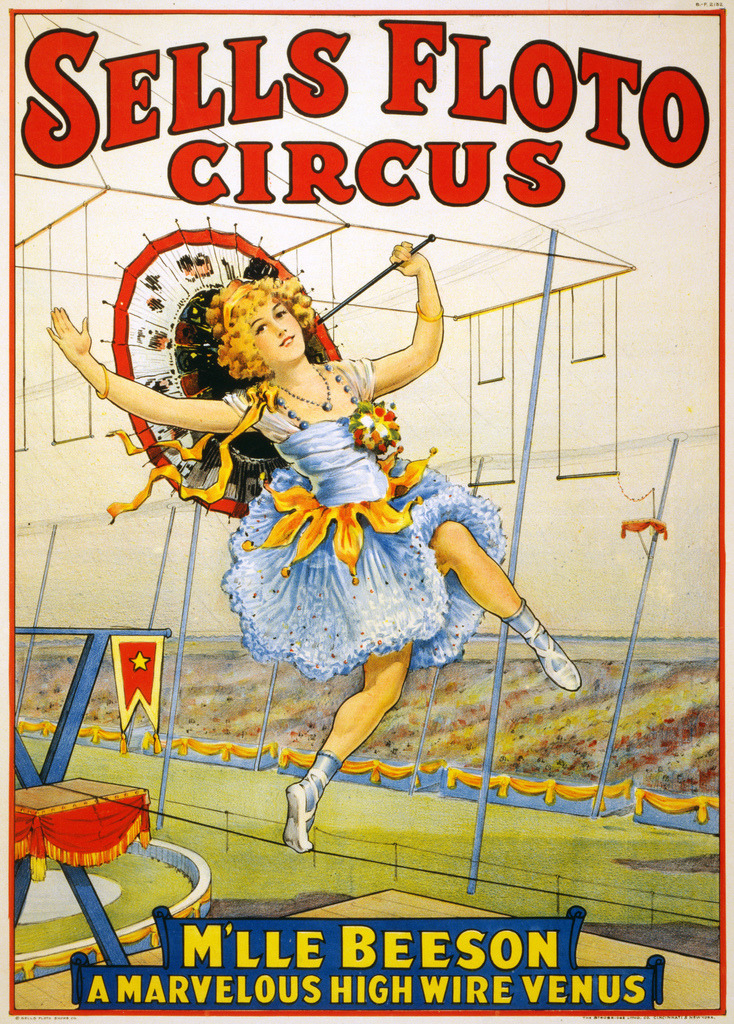 Sells Floto Circus – M’lle Beeson, A Marvelous High Wire Venus. Circus poster showing tight-rope walker Beeson prancing with a parasol, chromolithograph by The Strobridge Litho Co, Cincinnati & New York, 1921