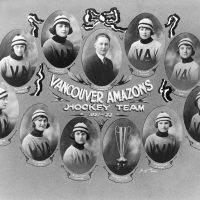 four Southwest Louisiana Institute (known today as University of Louisiana at Lafayette) female athletes (left to right: Rose Aimee Landry, Louise Haas, Edith Post, Gladys Boudreaux) each wearing a sweater with an ’S’, in 1929