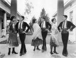 a group of Spanish dancers performing in the pageant at the California Valencia Orange Show. the three couples, identified as Onufre Madrid and Ben Gonzalez, Helen Madrid and Carlos Budrow, and Faustina Lucero and Paul Gonzalez, are in Spanish costumes, posing under a colonnade at the Anaheim Union High School, 1920s