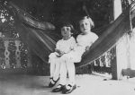 1923 photo on the porch of Samuel Matlick’s farm, in Bishop, California. The two girls are Janet Matlick Stephens, age 3, and her sister, Mary Matlick Bowen, age 5. They are posing for a portrait done in oil by their mother, Myrtle Thomas Matlick.