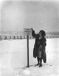 Violet Peterson standing in the snow wearing a bathing suit and a fur coat pointing at a no bathing sign, Minneapolis, Minnesota, 1923