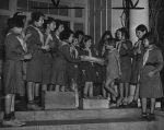 happily fulfilling their duty of being useful and helpful, Girl Scouts of Troop 83 of Carthay Center School are shown at the Los Angeles Orphans’ Home on November 26, 1936, presenting the makings of a fine Thanksgiving dinner to one of the home residents. Each year the Girl Scouts visit the home and provide entertainment