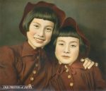 Two sisters. Hand tinted Showa period photograph of the late 1930s from the Hanaya Kanbei Studio in Ashiya, Hyogo Prefecture. These two cute girls are actually this famed photographer’s daughters
