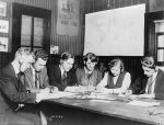 photograph shows six young men and women wearing radio headsets, seated around a table, participating in a ‘jamming’ contest which requires the transmission of messages with the least number of errors; from left: BB Jackson (winner), E Laufer, A. Rechert, Miss Abby P. Morrison, Miss Sonia Sobert, and George Barrows