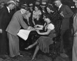 first petitions for submission of repeal of the Gandier liquor regulating ordinance at the June general election were put in circulation today and were being signed at hotels and various downtown places. This photo shows part of a throng signing one of the petitons at the Hayward hotel. The Gandier ordinance would limit sale of beer to a small downtown area, March 21, 1933