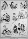 illustration shows a vignette cartoon depicting a mother raising her son, helping ‘with his lessons’, and giving him motherly advice, a woman as his life-partner, managing his home, and giving advice regarding ‘his most intimate personal affairs’. yet man believes her no better than ‘the convict and the idiot when it comes to her compentency to vote’