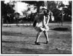 a woman is dressed in clothing decorated with ostrich feathers, doing the Charleston, her hands on her knees, Lincoln Park, Los Angeles