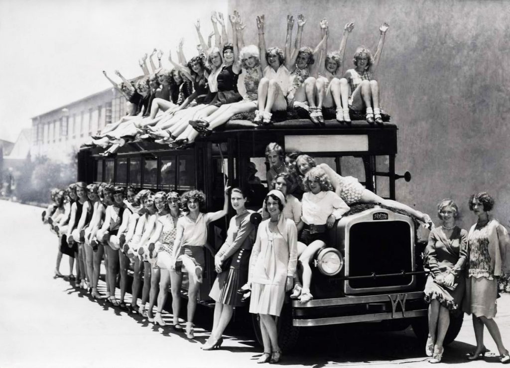 whataboutbobbed June 7, 2012 vintagegal: Busload of chorus girls and dancers at Warner Brothers. Studios, 1929