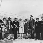 Anne Morrow Lindbergh (4th from right) and Charles Lindbergh (3rd from right) went on the first TAT transcontinental flight aboard The City of Los Angles trimotor (shown behind the group) that left Glendale airport in Los Angeles July 7, 1929 for the first leg of a 48-hour air and rail transcontinental rout. Amelia Earhart is in the photo – 3rd from left