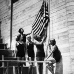 Georgia Coleman, LAAC diving champion, raises the American flag at the Olympic swimming stadium. left to right – Marion Dale, Jennie Crammer, Olive Batch Voight, Georgia Coleman and Dorothy Poynton, July 7, 1932