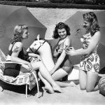 reverse of Santa Monica Beach, 1941 photo reads – newest in beach diversions is the old art of sun-tattooing using the boy friend’s military insignia as stencils. Anne Gwynne (left), currently working with Abbott and Costello in their new Universal comedy Ride Em Cowboy, is absorbing the Chief Petty Officer’s impression, Helen Parrish is wearing Seaman, Third Class, while Evelyn Ankers, in Universal’s Hold That Ghost, is sporting Naval wings