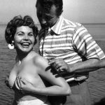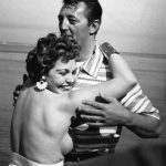 Robert Mitchum (August 6, 1917 – July 1, 1997) can do nothing but watch as Simone Silva covers her cans at the 1954 Cannes Film Festival