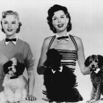 Anne Francis (September 16, 1930 – January 2, 2011) and Ann Miller, MGM stars, have started a bow-tie craze in Hollywood and got plenty of cooperation from their poodle friends who seem to take to the natty neckwear, July 12, 1956