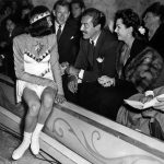 stars of the ice meet the stars of the screen – Betty Schalow, the big surprise in the number ‘Sunrise’, dressed as an Indian maiden, meets actor Cesar Romero and actress Ann Miller, September 19, 1947