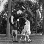 a young woman identified as a ‘Model Mother’ from the Blue Book Model Agency can be seen on the grounds of the Ambassador Hotel chatting with a small child. photo dated – October 9, 1945