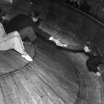 having fun on one of those fast and tricky revolving wheels at a Venice Fun House, Priscilla Morse laughs as Henry Barry tries to help Winifred Stoddard back on the center, October 19, 1940