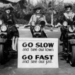 three fair motorcycle officerettes are on duty, ready to receive visiting delegates attending the eighth annual convention of the California Association of Highway Patrolmen held at the Alexandria Hotel. The women are ready to receive them with the warning ’Go slow and see our town. Go fast and see our jail’. Just because the officer’s are off duty, delegates are warned not to exceed the Los Angeles speed limit. From left to right: Miss Hildur Fleming of Central station, Miss Myra Richardson, secretary to the arrangements committee, and Miss Beryl Wilson of Wilshire station. photo dated – October 17, 1927