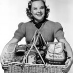 Sonja Henie, 20th-Century Fox film star, finishes packing a Christmas Basket to be sent to Chicago for the sixith annual Movie Christmas Basket Parties, which will be held in most of Chicago’s neighborhood theaters on the morning of Monday, December 23rd. Non-perishable foodstuffs will be acceptaed for admission, the food to be distributed to the needy of the city. Last year more than 32,000 baskets were distributed in this manner