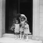 Washington youngsters surprise Mrs Coolidge with May Day basket of flowers. […] the First Lady of the land opened the door of […] morning she found a May Basket of flowers ha[…] nob. The basket, filled with daisies, was pu[…] little Washington children to tell Mrs Coolidge […] is Child Health Day.“ The daisies represen[…] "Better Health for Children” movement. The […]ph are Nan Norton, Elizabeth Ann Taylor and […] Cooley, April 30, 1927