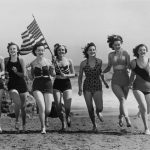 Ziegfeld girls march on the beach with an American flag. From left to right – Claire Owens, Claire Manners, Frances McInerny, Mary Lange, Monica Bannister, Bonnie Bannon, and Wanda Perry. photo by John Springer, 1936