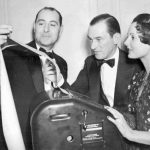 Jimmy Walker, former New York Mayor, and his wife, the former Betty Compton of the stage, watched election returns at Democratic Headquarters as they came in over the telegraphic printer. Instructing them in the workings of the machine is William Farley (left), brother of the Democratic National Chairman