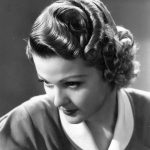 Jean Rogers, lovely blonde Universal player, whose charm recently won her the lead in the forthcoming Universal production Reported Missing, is pictured here in a charming new hair-dress which Emily Moore, Universal hair stylist created for her in Rococo mood. While in a garland of casually combed curls surround the head, the top is held very straight, decorated with a bow made of hair