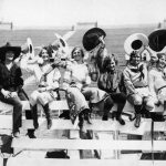 cowgirls Fox Hastings, Ruth Roach, Tad Lucas, Florence Hughes, Bonnie McCarroll and unknown sit on a fence and wave before the World’s Championship Rodeo at the Sesqui-Centennial International Exposition, Philadelphia, Pennsylvania, July 10, 1926