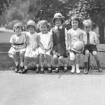 left to right – Bridget Gibbs, grand-daughter of the Earl and Countess of Carrick, Diana Margaret Corbett, Hazel Phillips, Pamela June Colt, Georgina Moira Wood, Somerset Brian Gibbs, grandson of the Earl of Carrick and son of Lady Rosamund Gibbs, enjoying the sunshine in Hyde Park, London – July 24, 1931