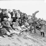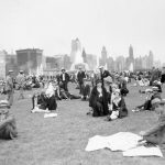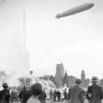 crowds sitting in Chicago, Illinois, watching the Graf Zeppelin (navigated by Dr Hugo Eckener) fly over the city on August 28, 1929