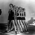 a line-up of bathing beauties are being directed by Sammy Lee, sitting in the background, during the filming of MGM’s Revue Of 1930