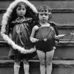 Rose Lanza (left) and Josephine Farrara (as a cupid) in fancy dress for a parade on Cherry Street, Manhattan, New York City, circa 1915. The parade is being organized by the Madonna House Catholic mission. photo by Paul Thompson
