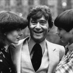 Vidal Sassoon stands between two contrasting examples of his hairdressing at a teach-in at the Albert Hall, where he returned to hairdressing after a five-year break. photo by Tim Graham for the Evening Standard, February 3, 1975
