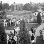 a garden party on the south side of the Dodge-Hamlin House, Colorado College. In the background, from left, Ticknor Hall (1898), Bemis Hall (1908), and roofline of McGregor Hall (1903)