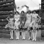 Their dresses are coordinated in construction and materials, but not expensive or professionally made (that is, they don’t seem perfectly tailored for each individual nor like they were made for traveling theater stars of any kind who might have been in the area to perform at the Shuler or with a circus). Despite the coordination of their clothing, their shoes don’t match. The group is wearing heavy make up in a way that says “entertainment.”
