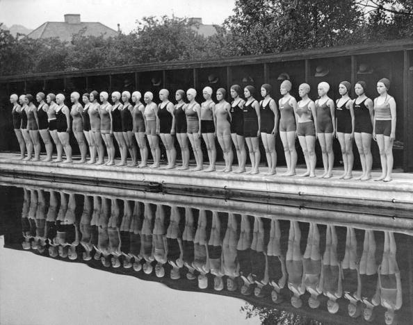 whataboutbobbed July 17, 2015 swimmers lined up at the pool are reflected in the water, England, July 17, 1935