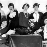 June Baker, WGN’s household advisor, seated on left, and her staff of experts who present on Miss Baker’s program every week day at 2 pm over WGN radio, circa April 22, 1934. The experts on Miss Baker’s programs conduct Tribune editorial columns about the various activities of homemaking. Left to right, seated – June Baker, general household expert, and Helen Bartlett, etiquette. Standing are Louise Bargelt, remodeling and home building, Nancy Cabot, needlework, Edith Weigle, furniture, Mary Meade, cookery, and Rhea Seeger, fashions — Chicago Tribune