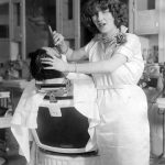 the first female hair stylist from New York, Miss Jeanne Devereux, busy shaving a customer, 1927