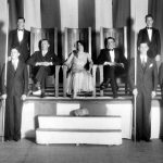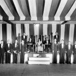 St. Pat, right (seated), W.W. Weltmer, ‘30, and Princess Pat, Miss Virginia Rogers, ruling sovereigns of the Spring Ceremonial of the School of Engineering at North Carolina State College, waiting to confer Knighthood upon members of the senior class who have proved themselves engineers. The traditional Blarney Stone, Prized relic of the School of Engineering, appear on the top step of the dais