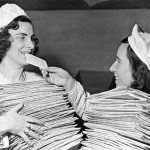 whataboutbobbed April 22, 2016 two young women who assisted in American Jewish Joint Distribution Committee’s baking of Passover matzahs for Jewish Displaced Persons after WWII. Berlin, 1946 PAPPY PASSOVER PEOPLE!!!!