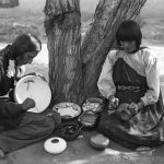 Maria and Julian Martinez from San Ildefonso Pueblo demonstrating pottery making techniques in courtyard of Palace of the Governors, Santa Fe, New Mexico