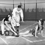 Pirate Idea – feminine pulchritude never hurt any merchandising campaign. So here’s Manager Pie Traynor of the Pittsburgh Pirates in a little skit with two cute corsairs at the training camp in San Bernardino, California. The pert Pirates are sliding Kathleen Williams and catcher Yvonne DuVall