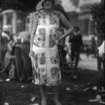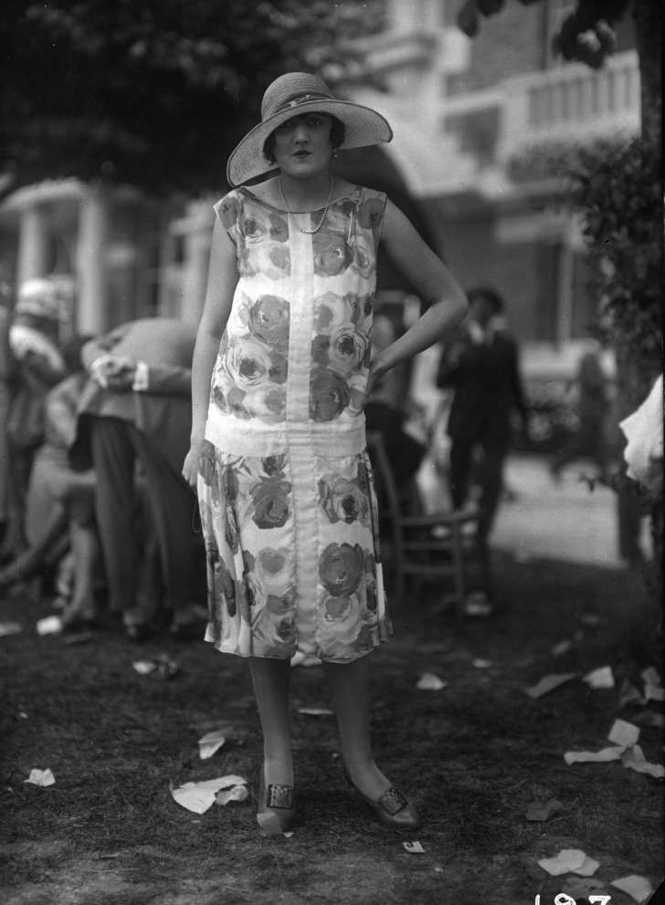 whataboutbobbed June 6, 2018 a cap-sleeved summer dress in large flower print worn with a large brimmed hat, designed by Jane Briault, 1925