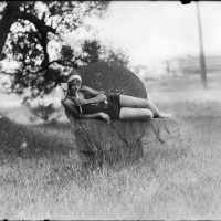 Here is something new in the way of evening frocks. Louise Brooks, Paramount player, presents the very smartest and newest line for the fall frock that is formal. White chiffon, beaded with pearls and crystals follow the lines of the figure closely to the knee and the flares into a very full circular cloud of plain chiffon. The short-long effect is gracefully adhered to.