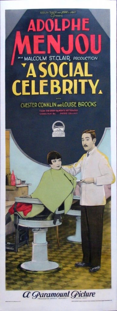 Louise Brooks’ bob has a date with Adolphe Menjou’s shears, on the poster for 1926’s A Social Celebrity