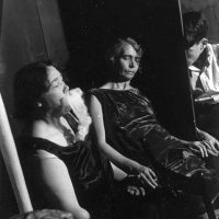 Varvara Stepanova designs for the performance of An Evening of the Book with the protagonists standing in front, photographed by Alexander Rodchenko, 1924