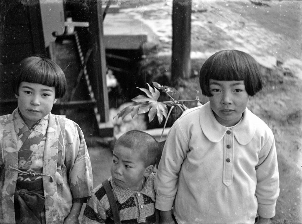Arab woman in traditional dress, seated with boy and girl (possibly members of the American Colony), looking at comics the funnies are funny in any language