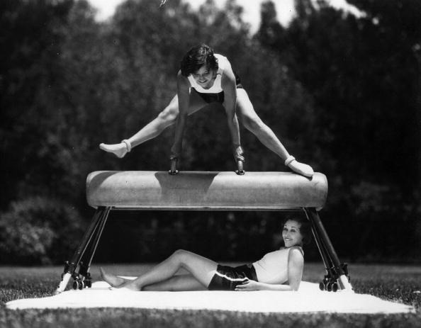 Kathryn Crawford the Hollywood film star and actress, seen here exercising on a vaulting horse at the film studio whilst Duane Thompson, who is also a Universal player, takes it […]